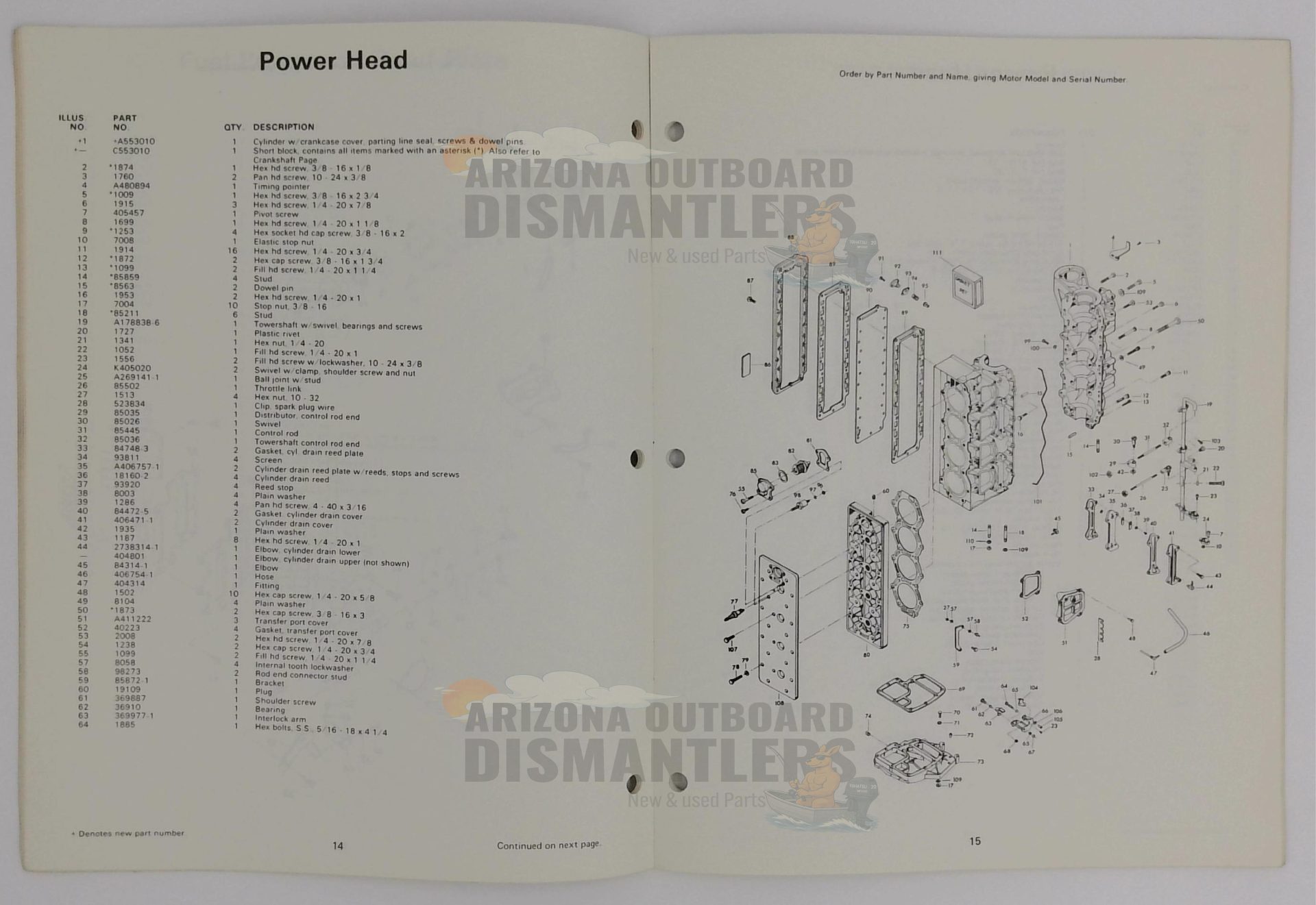 Detailed exploded views of every major engine system — including the powerhead, lower unit, steering, controls, and rigging