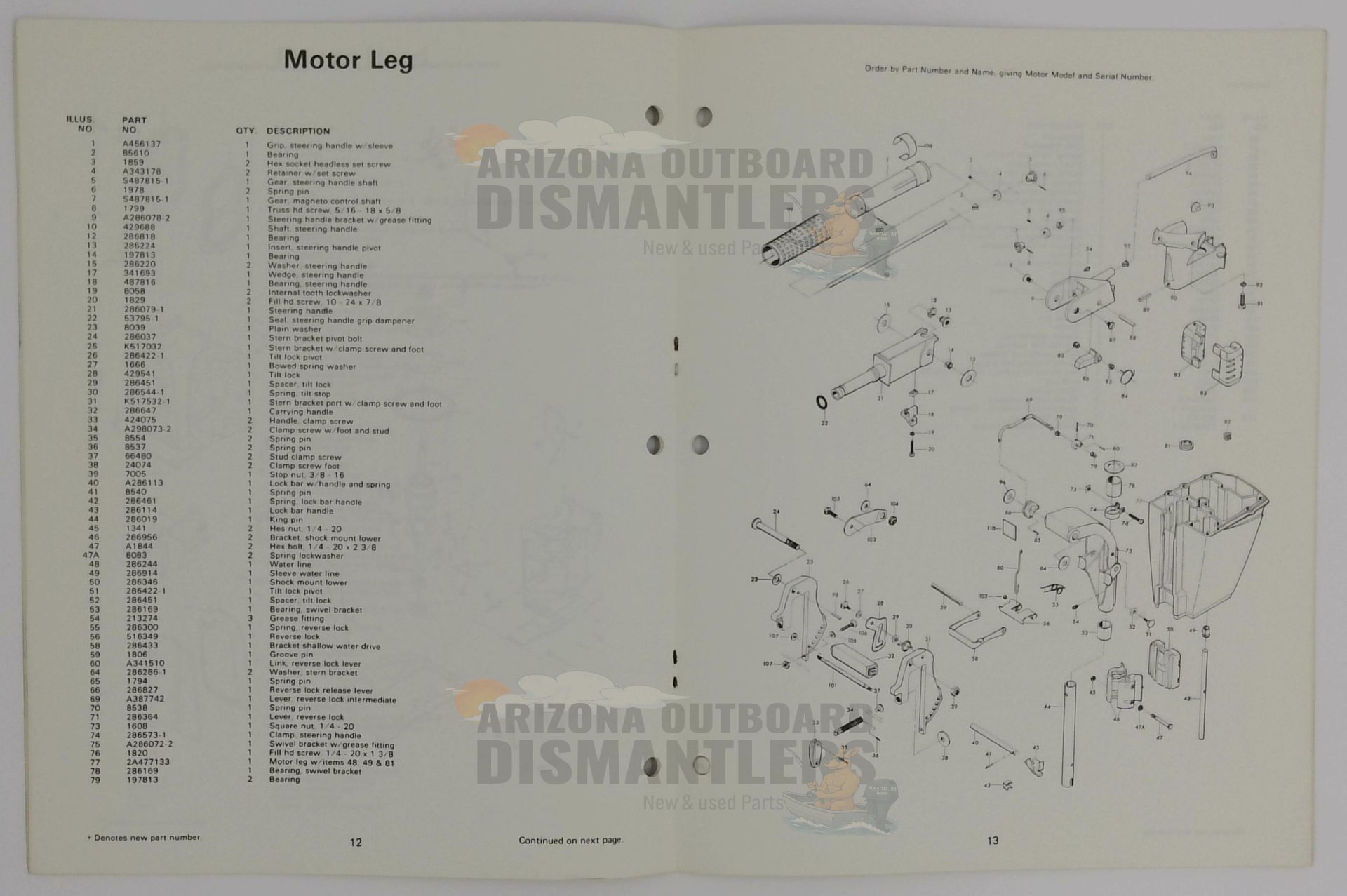 This Catalog includes full exploded diagrams, part listings, and clear illustrations for every section of the engine. You’ll find detailed references for the powerhead, motor leg, steering handle, and lower unit. Each part number is matched with its correct quantity and description, making it easy to identify exactly what you need.