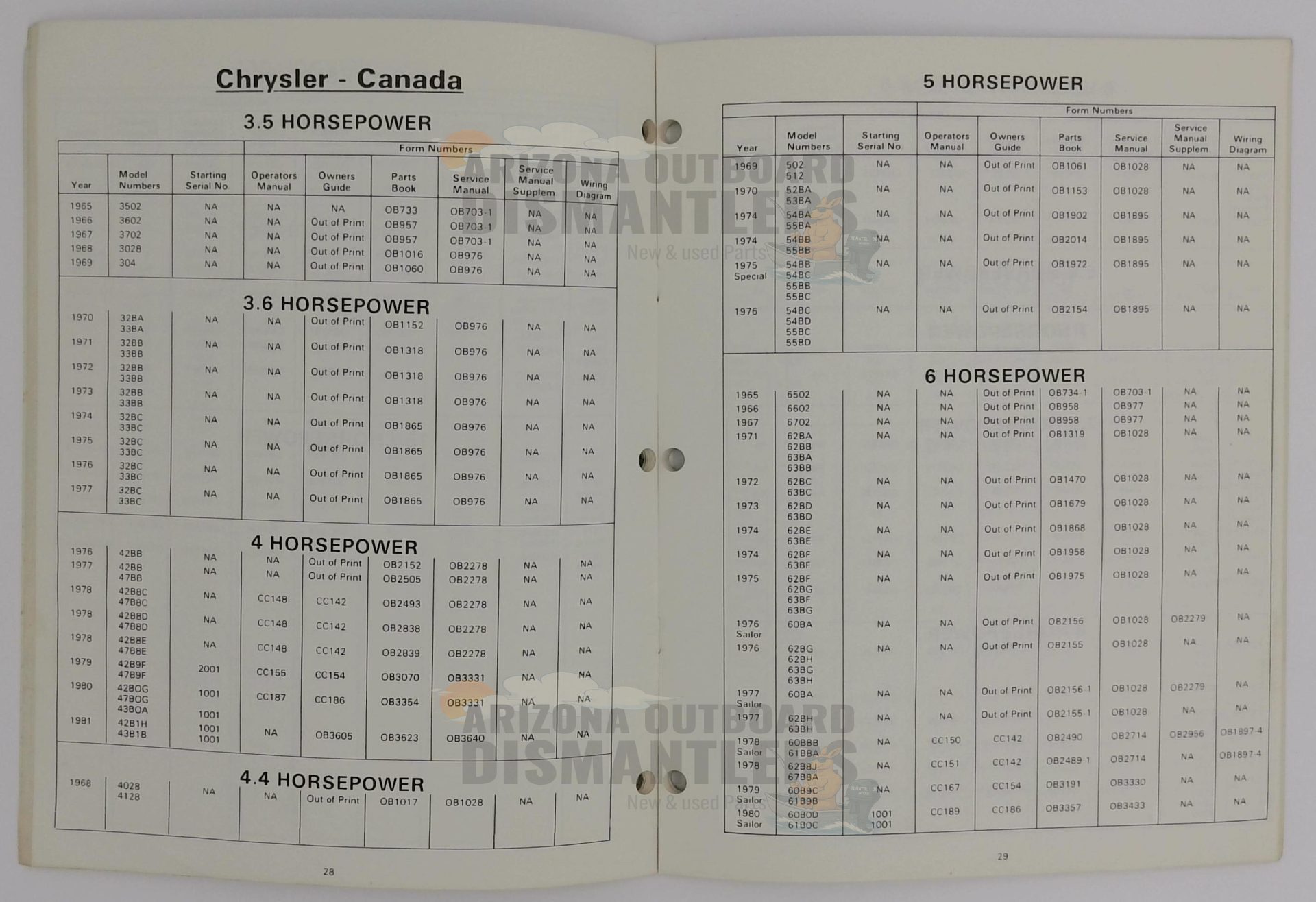 The OB3600 Chrysler Outboard Service Literature Catalog serves as a master index of factory documents for Chrysler marine engines. It lists the available operators manuals, parts books, service manuals, wiring diagrams, and supplements by model and year.